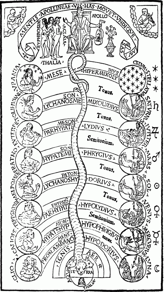 In a discussion in the Republic of the whirling motion of the celestial spheres, Plato says that a Siren sits on each of the spheres, thus indicating that by the motions of the spheres the deities were provided with song; for a singing Siren is equivalent to a god in the Greek acceptance of the word. “Furthermore, cosmogonists have chosen to regard the nine Muses as the harmonious song of the eight spheres and the only predominant harmony that comes from all of them.” Furthermore, they call Apollo, god of the Sun , the “leader of the Muses”, as if to say that he is the leader and the leader of the other spheres, just as Cicero, referring to the Sun, called him leader, leader, and regulator of the other planets, mind, and moderator of the universe. Even the Etruscans recognize that the Muses are the song of the universe, as their name is Camenae, a form of Canenae, derived from the verb canere. That priests recognize that the heavens sing is indicated by their use of music in sacrificial ceremonies, as some nations prefer the lyre or lyre, and some flutes or other musical instruments. Even in the hymns to the gods the verses of the verse and the antistrophe were set to music so that the verse represented the forward motion of the celestial sphere and the antistrophe the reverse motion of the planetary spheres; these two movements produced the first hymn of nature in honor of the Supreme God. Even in funeral processions, the customs of different peoples have decreed the use of musical accompaniment, due to the belief that souls after death return to the source of sweet music, that is, to Heaven. Every soul in this world is enticed by musical sounds so that not only those who are more refined in their habits, but also all the barbarian peoples, have adopted songs from which they are inflamed with courage or courted with pleasure; for the soul carries with it in the body a memory of the music it knew in Heaven, and is so fascinated by its charm that there is no breast so cruel or savage as not to be seized by the spell of such a plea. (…) We have just explained that the causes of harmony are traced back to Soul Mundi, having been entwined in it; the Soul Mundi, moreover, provides all creatures with life: “Hence the race of man and animals, the life of winged things and the strange shapes that the ocean carries under its glass floor”. Consequently, it is natural that everything that breathes is enraptured by the music since the celestial Soul that animates the universe has sprung from the music. In accelerating the spheres to movement it produces tones separated by unequal intervals but nevertheless carefully proportioned according to its primordial fabric.